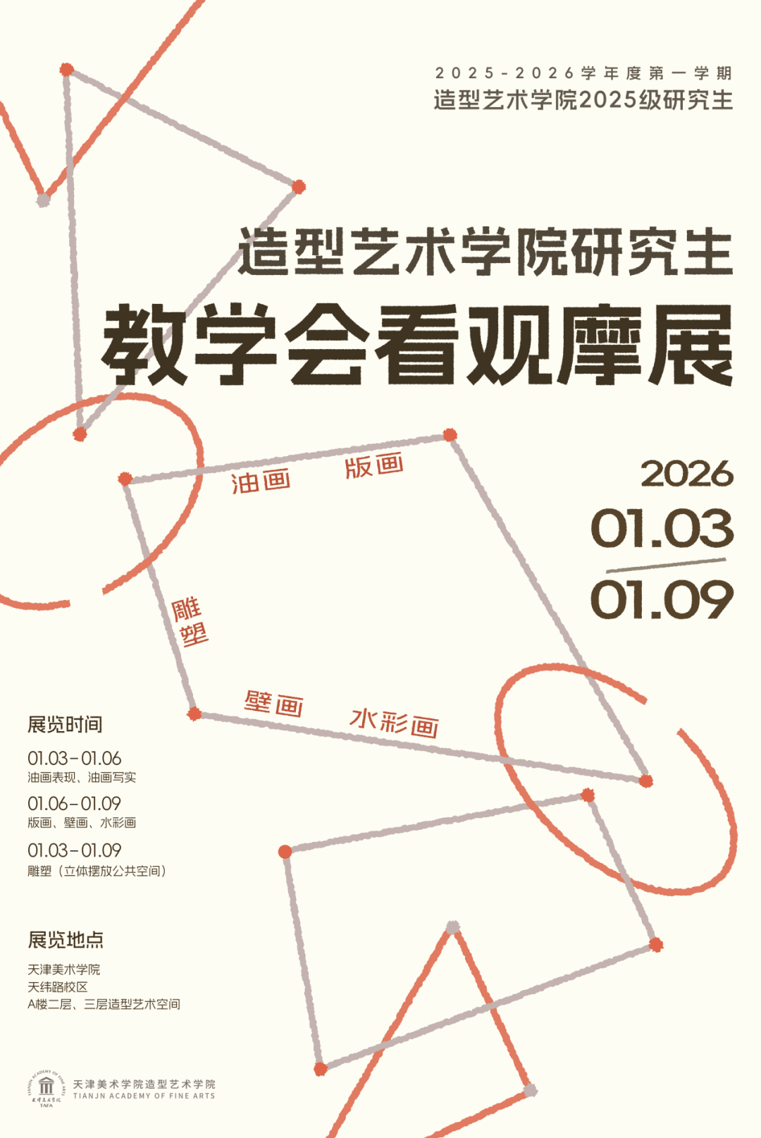 2026年1月3日至1月9日,造型艺术学院2025级研究生教学会看观摩展在天纬路校区A楼造型艺术空间顺利举办。本次展览集中呈现了80位研一学生的创作成果,涵盖油画写实13人、油画表现22人、版画18人、雕塑16人、壁画6人、水彩画5人,全面展现了学院研究生教学的初步成果与学生们的创作活力。同时研究生二、三年级也全面开展了作品会看工作,会看地点在各自教室与工作室。