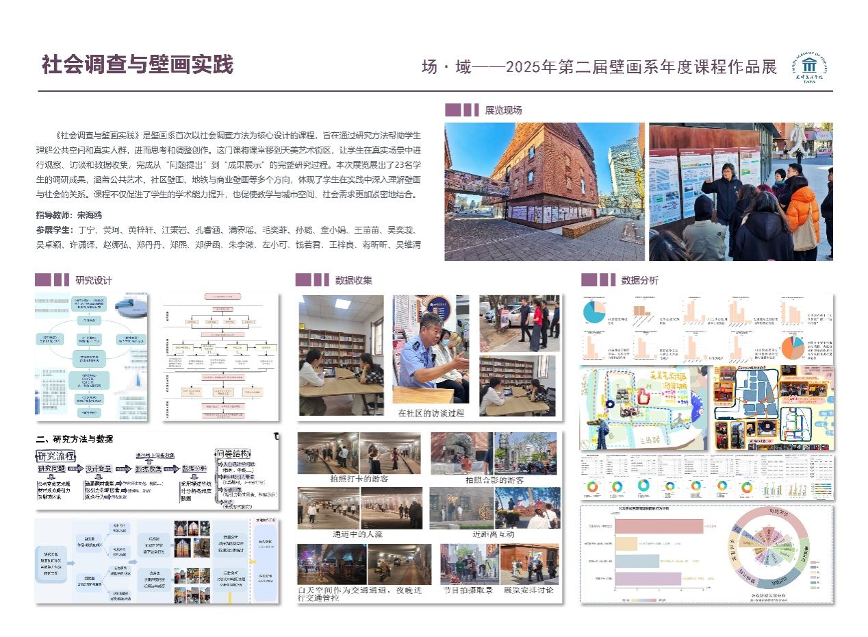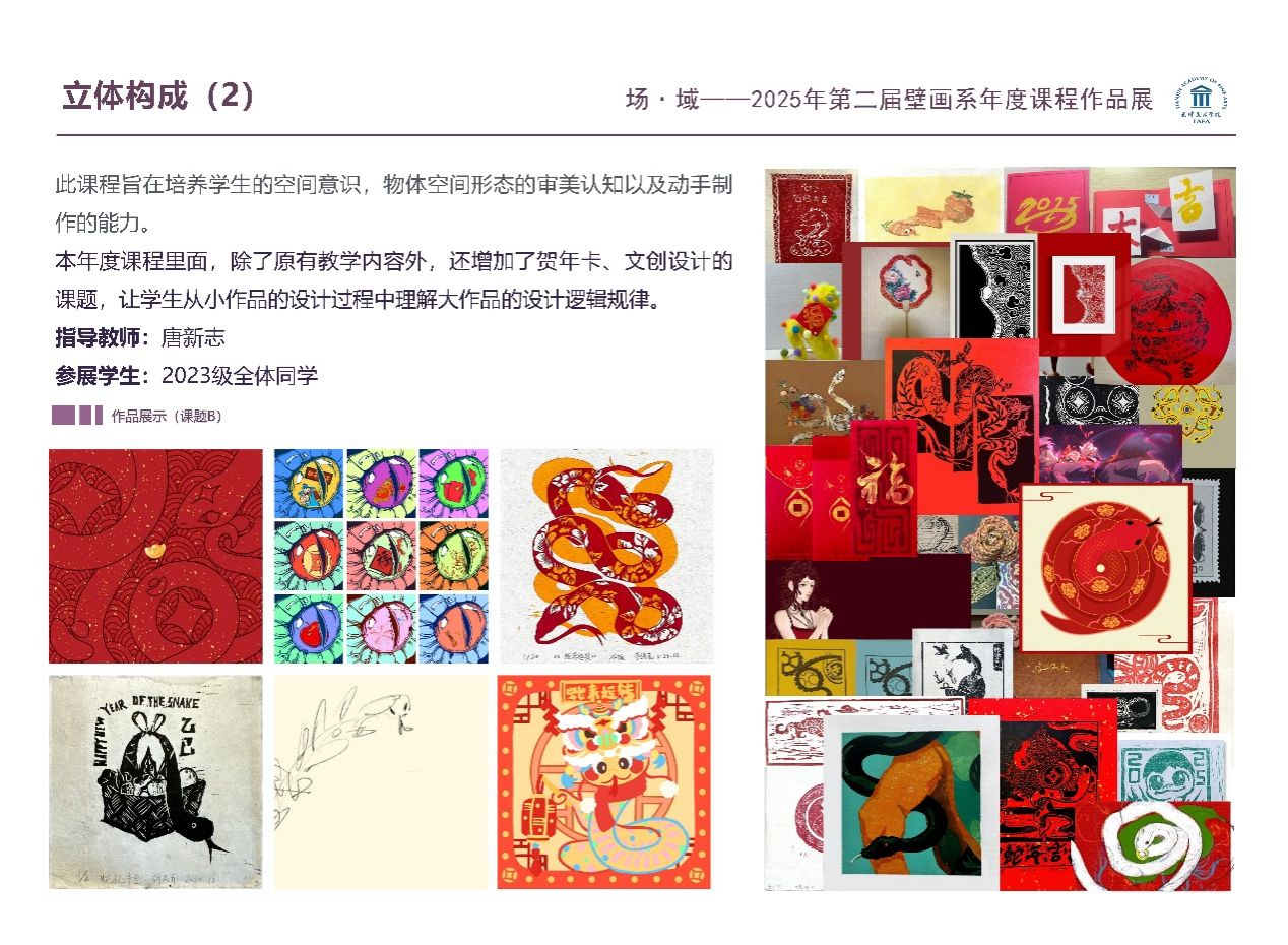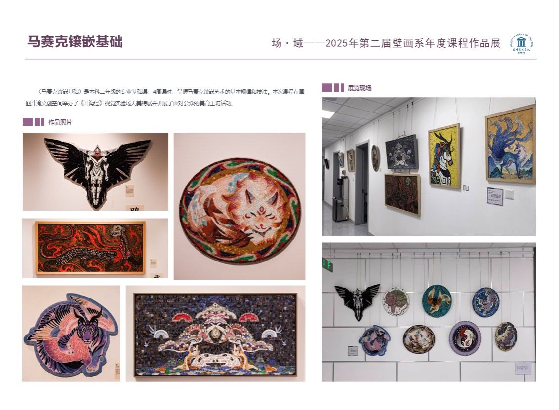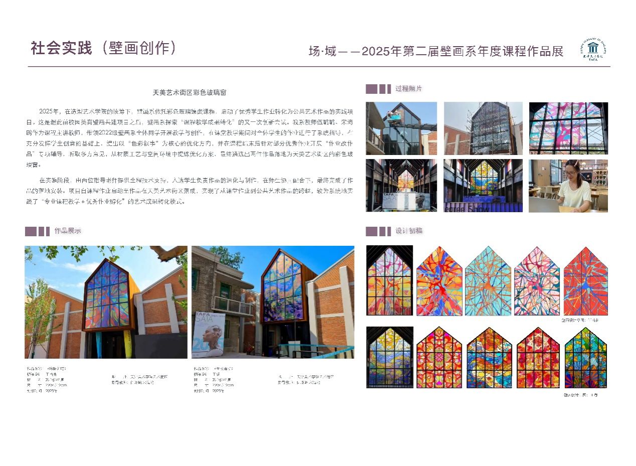 2025年12月,《场·域——2025第二届壁画系年度课程作品展》在天美艺术街区壁画系教学空间展出。展览集中呈现了2025年本科生二、三年级22门课程的近300件作品及6个社会服务项目,作品分布于壁画系教室、教学楼公共区域以及天美艺术街区室外公共空间,这既是阶段性教学成果总结,又是面向街区公众的艺术作品展示。