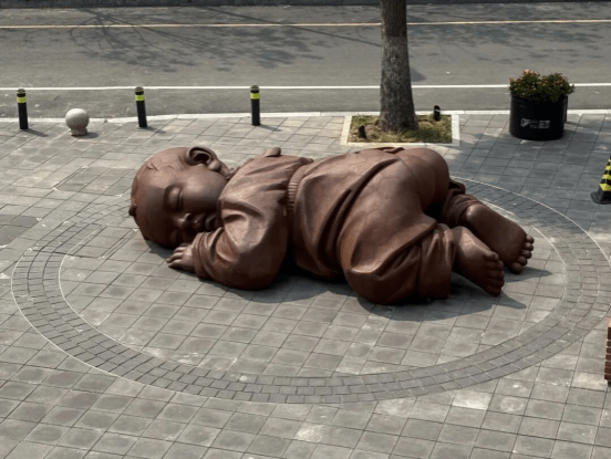 《大地之子》原本是一件以红砂岩为材质的大型户外雕塑作品,位于甘肃省瓜州县戈壁滩上。该作品长15米、高4.3米、宽9米,通过三维扫描、分块3D雕刻后逐块安装成型,呈现了一个匍匐于大地、恬然入睡的巨型婴儿形象,本次展览的是该作品的小版本。作品灵感部分源于战争中母亲保护孩子的悲壮故事的共情,但更核心的立意在于呼吁人类敬畏自然、保护地球。董书兵将婴儿与戈壁荒漠并置,通过粗粝的石材与柔软的生命形态对比,表达“人类是地球母亲的孩子,需依存自然共生”的哲学思考,暗含对环保的警示。
