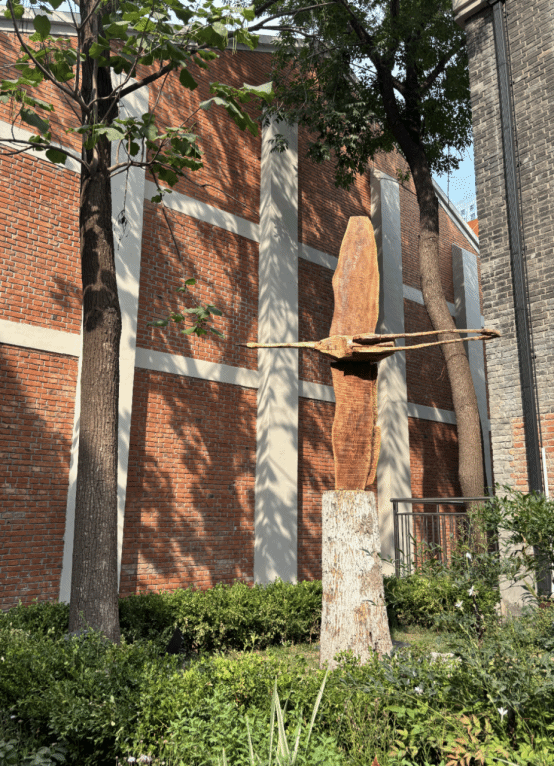 作品说明:这件作品采用了拼接的手法,保留了斧劈刀削的肌理,在十字形的架构下,硬朗的轮廓呼应着结实的形体,但又不失野鹤侧飞的轻盈感。