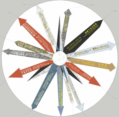 钓鱼岛、曾母暗沙、红旗拉甫山口、班公湖、珠穆朗玛峰、纽约时代广场、伦敦大笨钟、柏林勃兰登堡门、延安宝塔山、井冈山、泰山岱庙、西安大雁塔、敦煌莫高窟……其中有一些很小的地点,如大凉山一个小学生莫坡午甲的家、新疆策勒县一中、东山国际儿童诗歌海滩,可以和很政治的地点,如“中国黄岩岛”“加沙地带”“戈兰高地”并置,或者很大自然的地点如珠穆朗玛峰、澳大利亚大堡礁、马里亚纳海沟、维苏威火山并置。这里包含着地理信息、历史信息、文化记忆和政治联想,这样可以把我们天美学生、游客们的心胸气局都扩大,每一个地点,都通往历史,通往天地,也通往个人。从这里到无穷的那里,所有的远方都与我有关。
