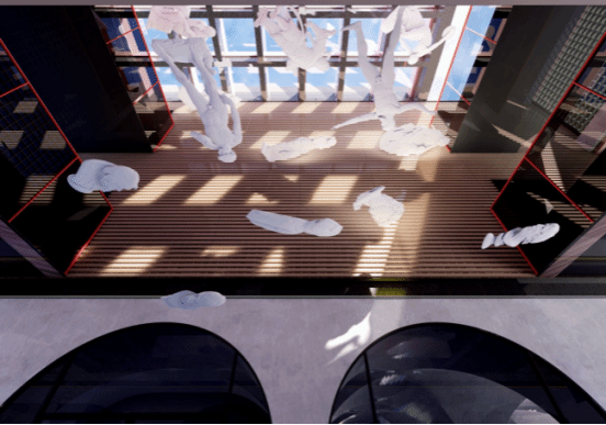 作品由十几件悬挂于空间中的中西方经典石膏像构成。它们既是学院系统中熟悉的视觉形象,更是美术史中重要的古典雕塑范式。以三维扫描技术重构石膏像的虚拟模型,再以特定角度压制成浮雕的形式。形体压缩而轮廓清晰,错落有致地漂浮于空中,如云朵般散布在洒满阳光的亭廊之间,在轻盈与压制的张力中,召唤对经典与传承的重新思考。