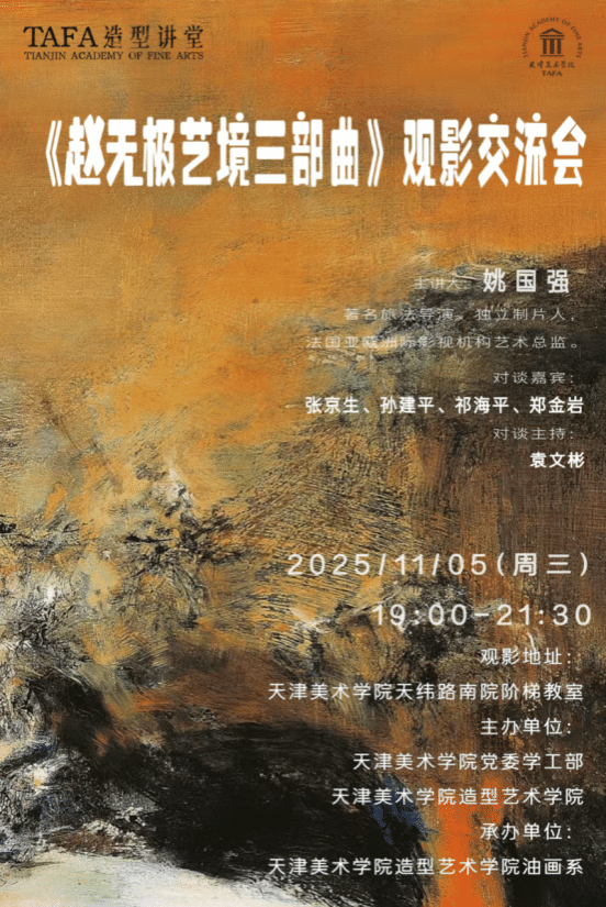 当东方文脉的深邃与西方艺术的张力相遇,便孕育出赵无极这样跨越时代的艺术巨匠。11月5日,天津美术学院在南院阶梯教室举办《赵无极艺境三部曲》观影座谈会,主讲人为著名旅法导演、独立制片人,法国亚欧洲际影视机构艺术总监,《赵无极艺境三部曲》导演姚国强先生。特邀嘉宾为原新华社高级记者、作家闵捷女士,对谈嘉宾为张京生教授、孙建平教授、祁海平教授、郑金岩教授、闫秉会教授、作家画家康泓女士。