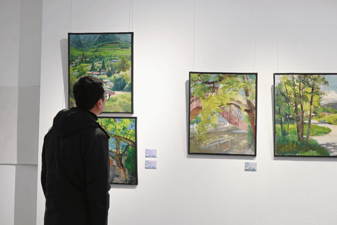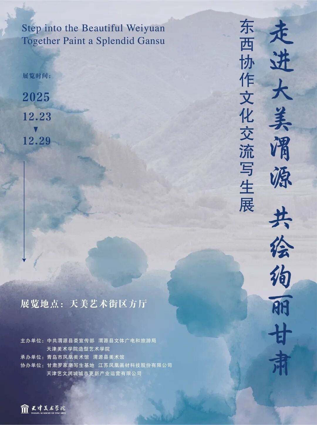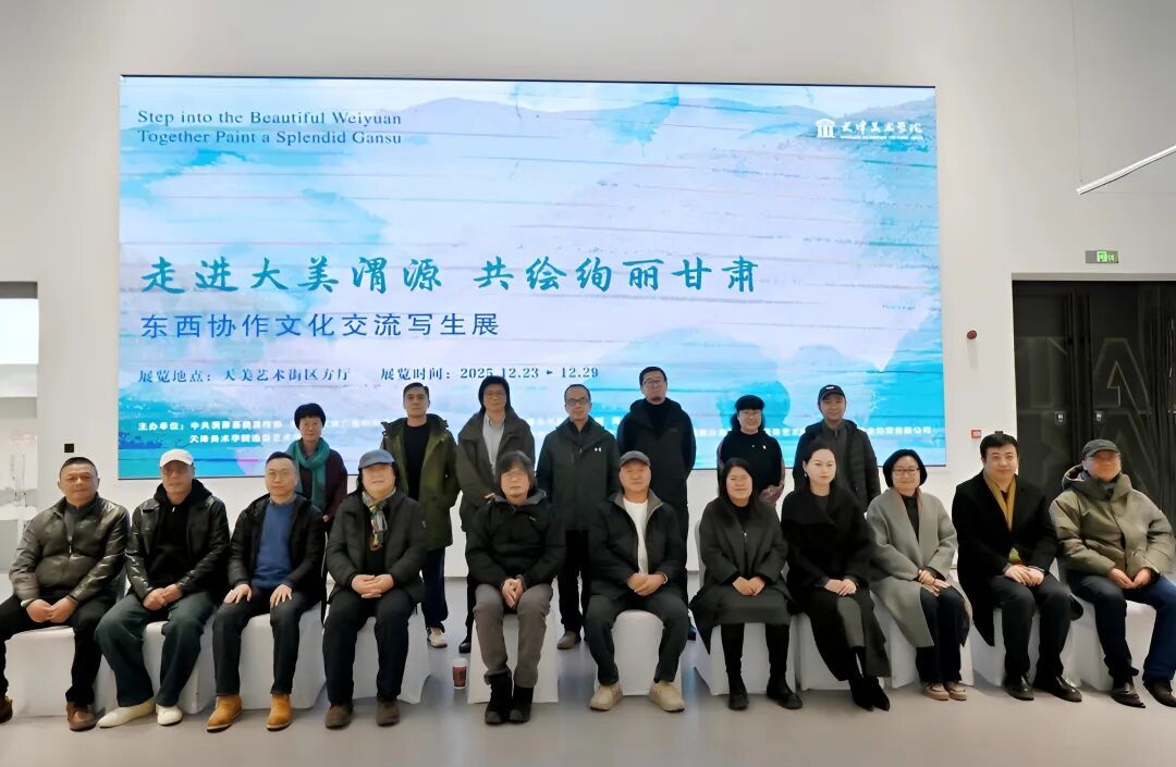 2025年12月24日,“走进大美渭源 共绘绚丽甘肃——东西协作文化交流写生展”在天美艺术街区开幕。参加开幕式的领导和嘉宾有:天津美术学院副院长寇疆晖教授、青岛海右书画院院长赵吉干先生、渭源县美术馆赵玲霞馆长、渭源县文体广电和旅游局席艳红主任、天津美术学院党委宣传部苏丹部长、天津美术学院科研与研究生处副处长蒋松儒教授、天津美术学院美术馆副馆长李旭飞教授、造型基础教育学院院长姜中立教授、造型艺术学院党总支书记张晶晶老师、造型艺术学院副院长谭勋教授,以及油画系主任袁文彬教授、雕塑系主任赵展老师、雕塑系副主任胡庆雁老师、壁画系副主任伍璐璐老师、版画系教师党支部书记华绍莹教授、版画系副主任彭勇老师和部分师生代表。
